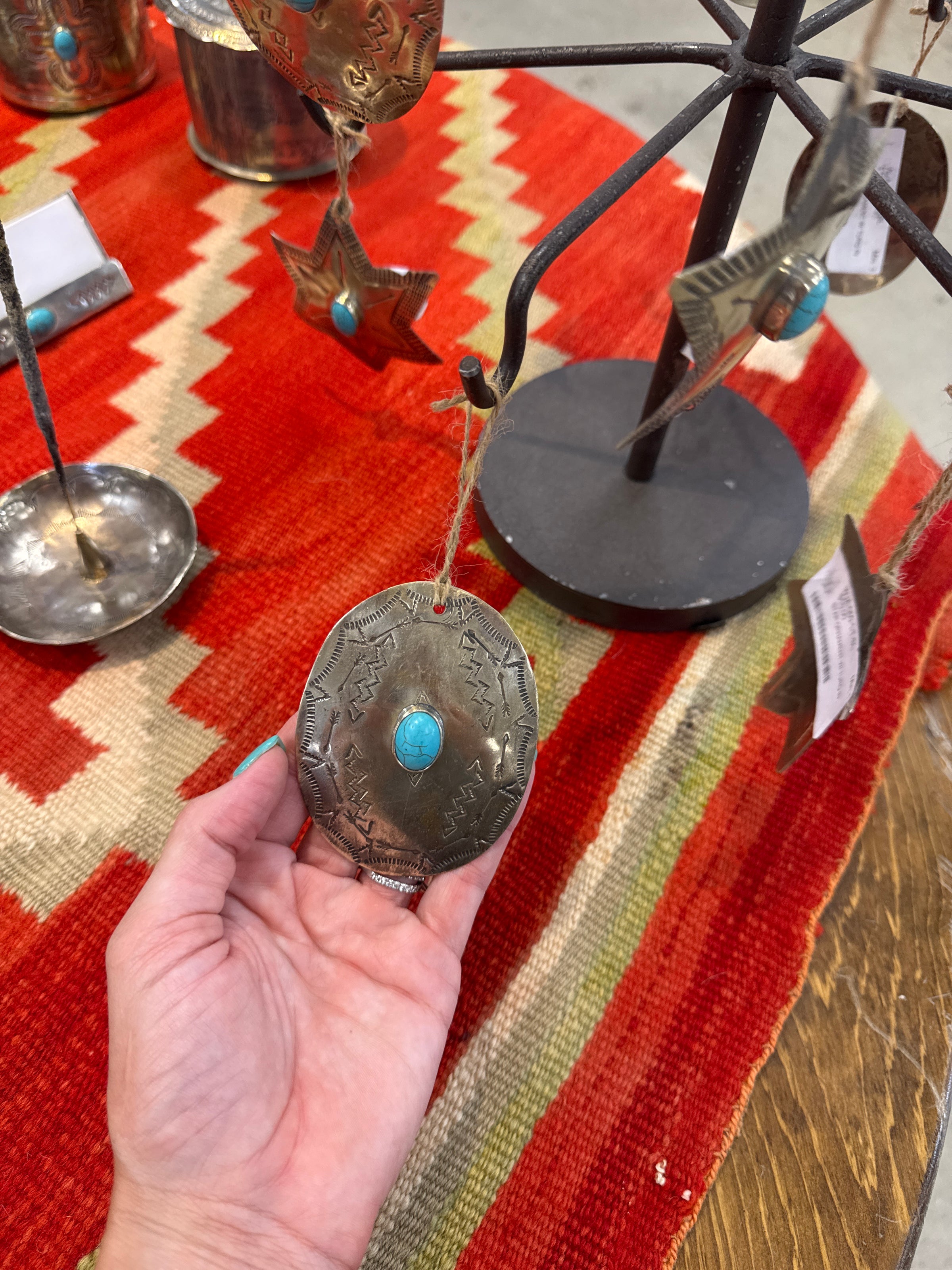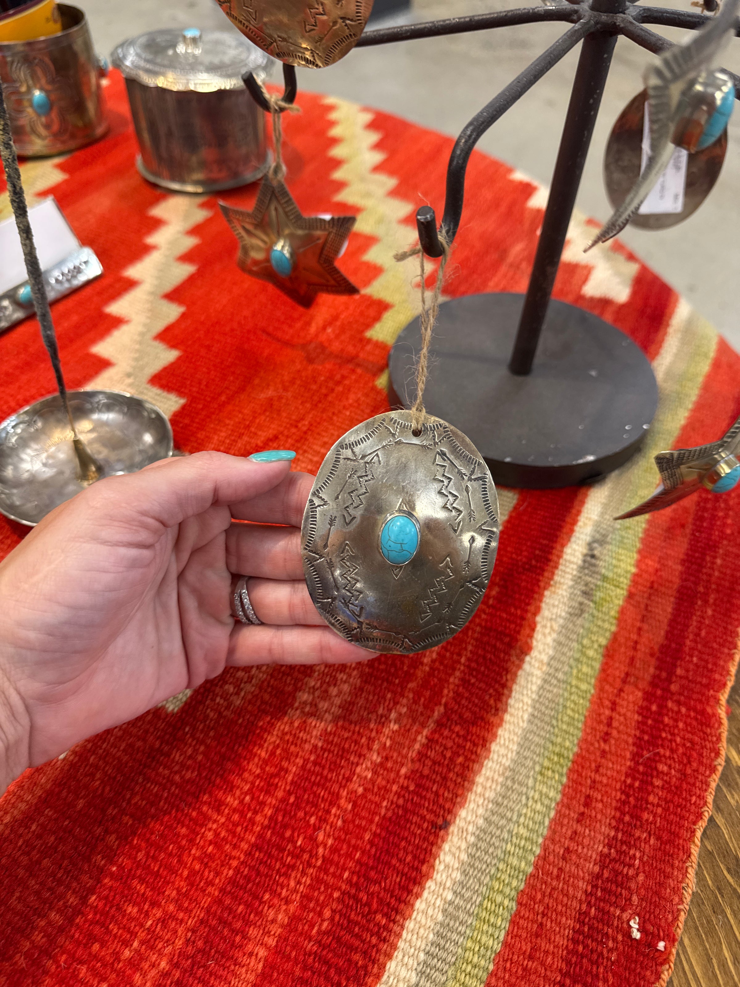 Expertly crafted with a unique and intricate design, this Silver Turquoise Ornament brings a touch of Southwestern charm to any space. Each piece is hand-tooled for a one-of-a-kind finish, adding a vintage touch to your decor. Elevate your style with this handcrafted ornament.