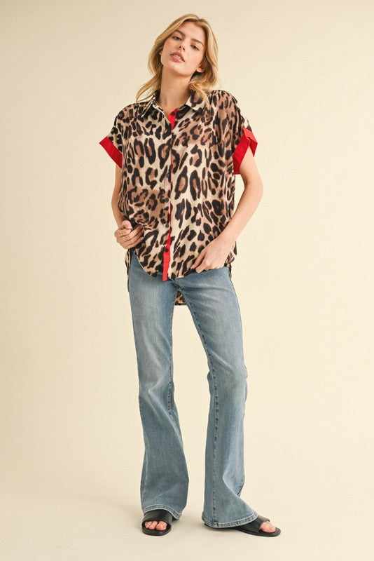 Add a wild twist to your wardrobe with this playful Contrast Trim Leopard Top. Crafted from smooth satin, it features chic cuffed sleeves and ruched shoulders for a flirty, feminine touch. The bold leopard print paired with contrasting trim makes it perfect for turning heads wherever you go.