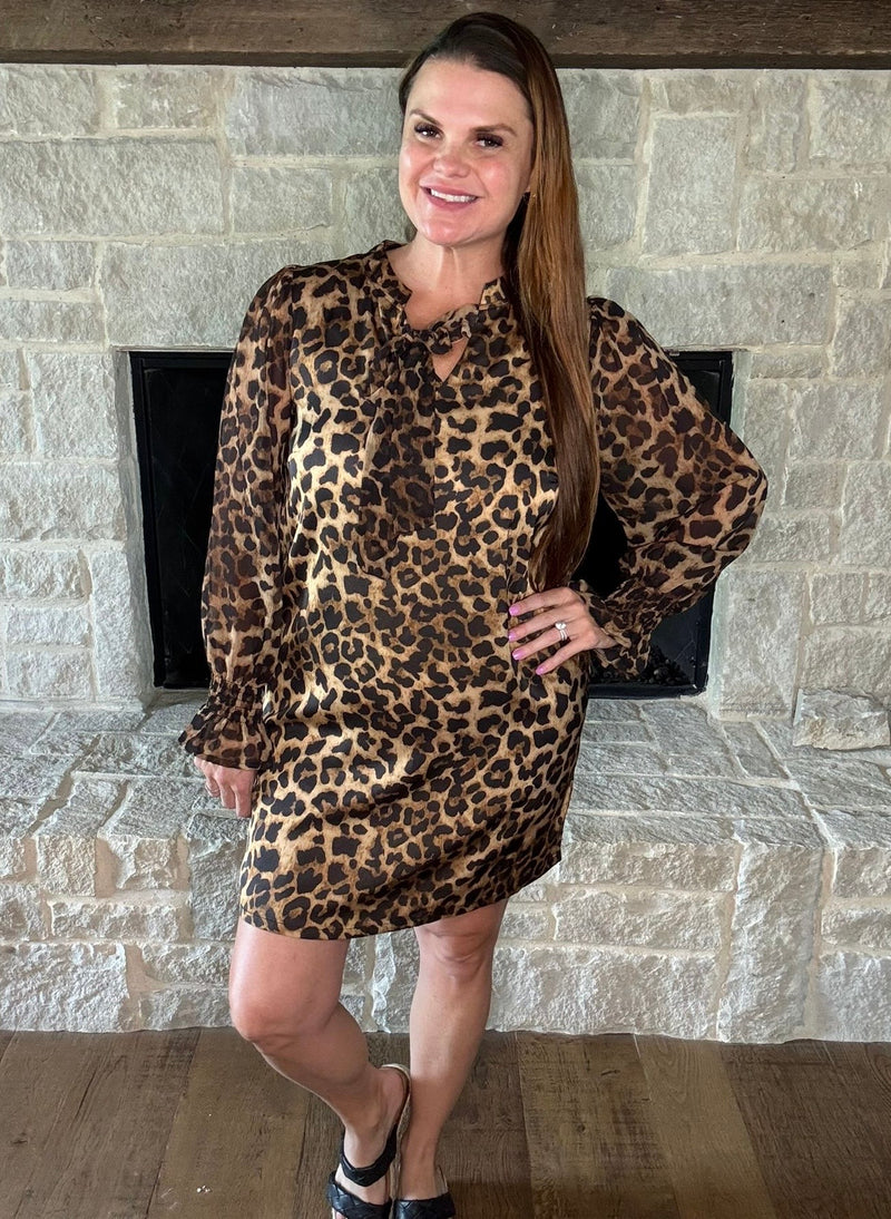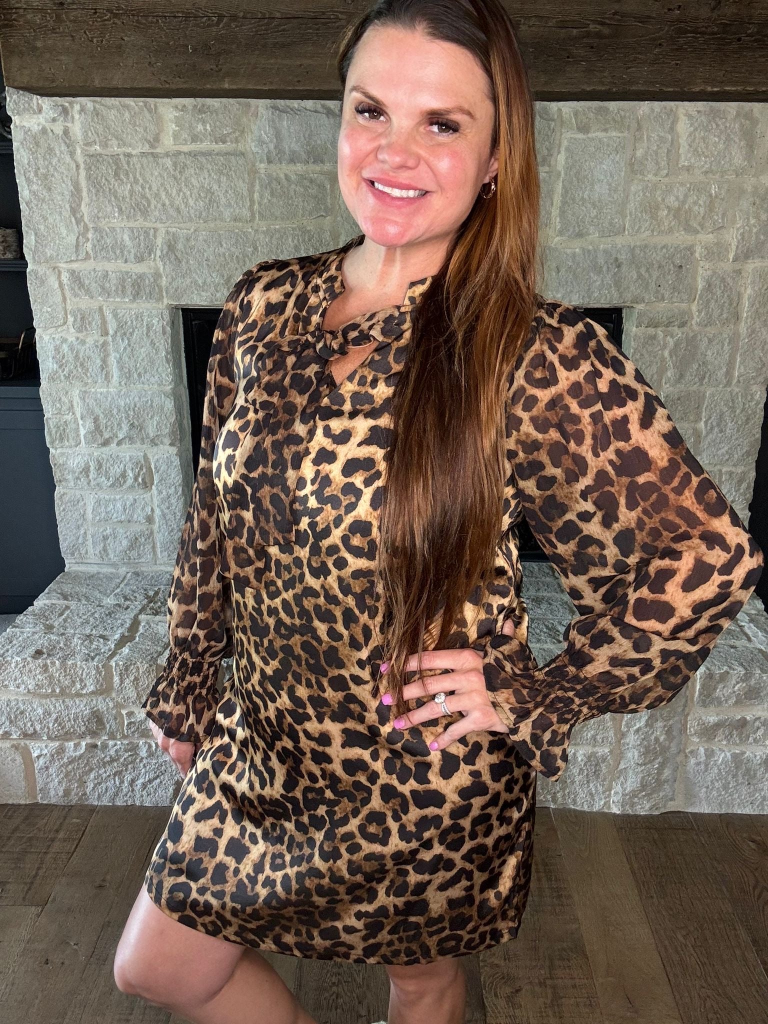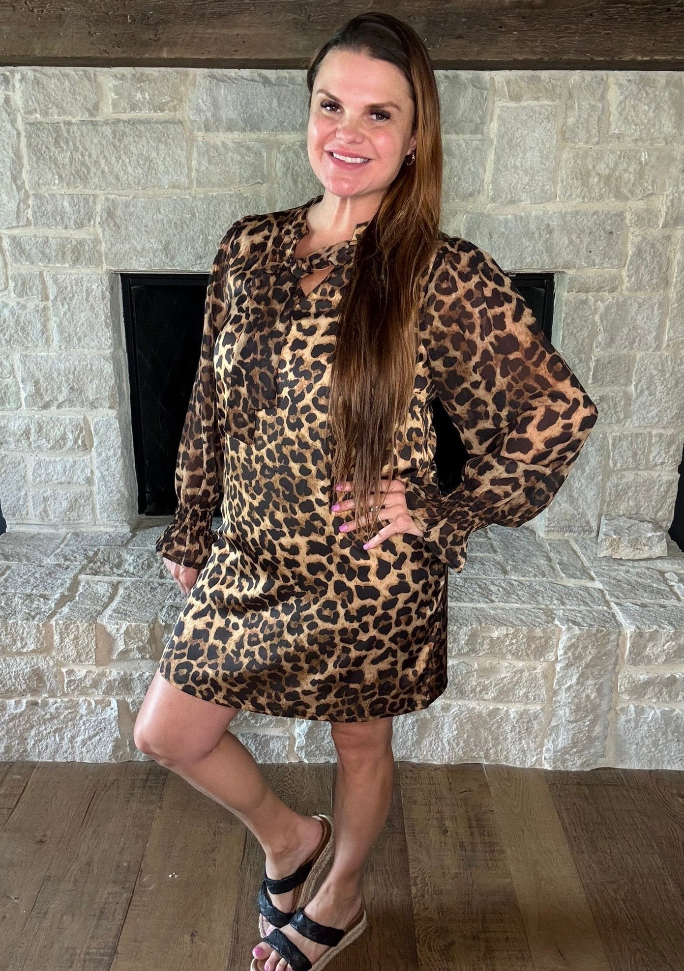 This Leopard Shift Dress combines bold animal print with refined details for a sophisticated look. Featuring a self tie at the neck, it allows for adjustable styling to suit your preference. The smocked cuffs add a tailored finish while ensuring comfortable wear. Perfect for making a statement with effortless ease, this dress balances trendy design with classic comfort.