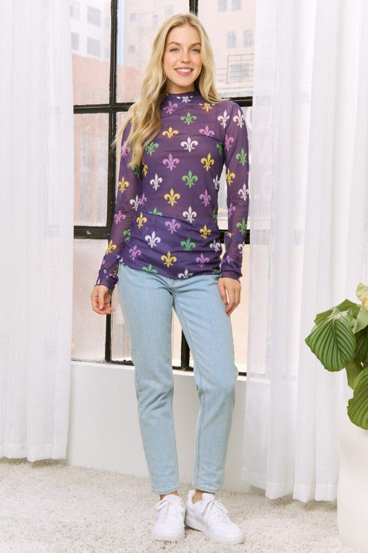 Bring the festive spirit to your everyday wardrobe with this Mardi Gras Mesh Top! The sheer mesh fabric makes it perfect for layering over your favorite basics, while the high neckline adds a touch of sophistication. With its flexible fit, you'll stay comfortable whether you're dancing through the streets or heading out for a night on the town. Celebrate in style with this versatile piece that transitions seamlessly from party to casual wear.