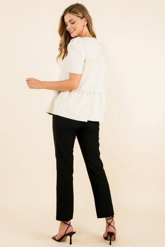 Get ready to turn heads in this sassy Tiered Top! Designed with luxe faux leather and short sleeves, it features tiers that create a flirty, dimensional silhouette. The playful layered effect adds movement and personality to your everyday style, while the faux leather gives you that bold, modern edge. Perfect for anyone who loves mixing a little attitude with their fashion, this top works beautifully dressed up or down. Grab yours and let your style do the talking!