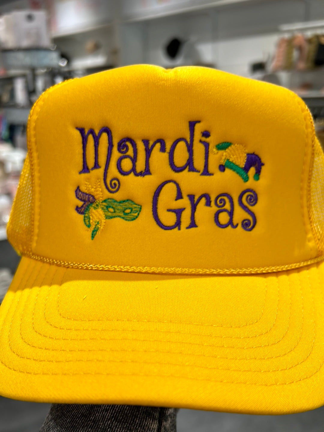 "Get ready to party with our Mardi Gras Trucker Hat! Featuring bright colors and a classic trucker style, this hat is perfect for adding a touch of fun to any outfit. Say goodbye to boring headwear and hello to a festive celebration with our quirky and playful hat. Let the good times roll!"