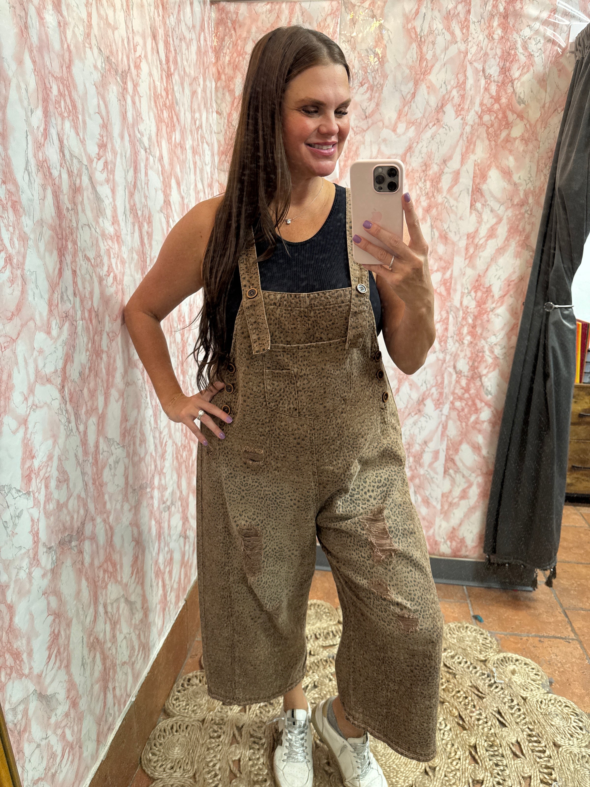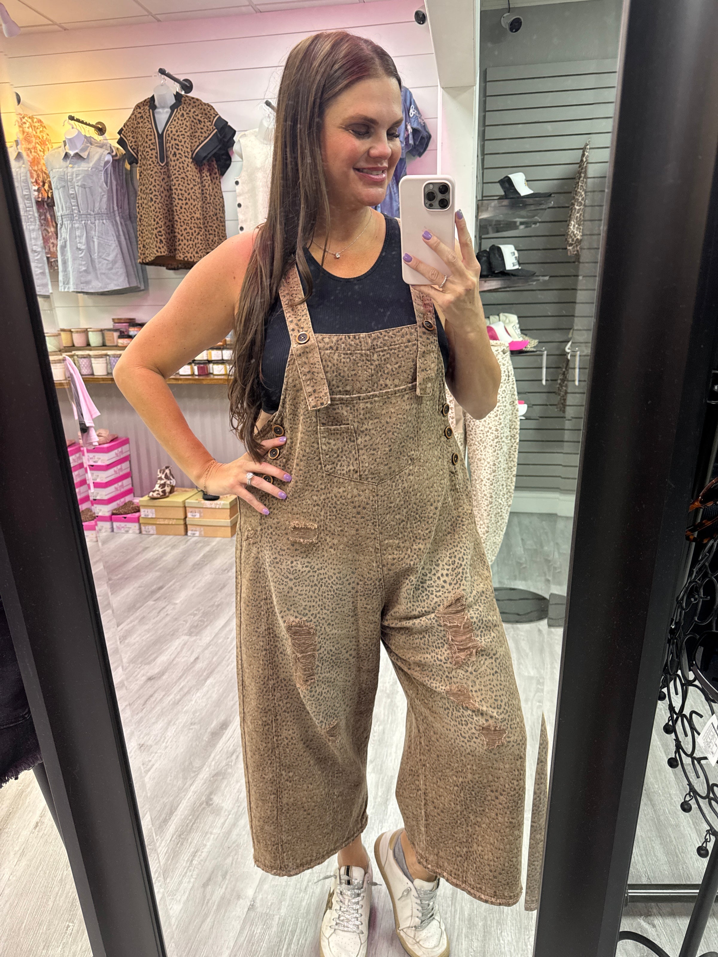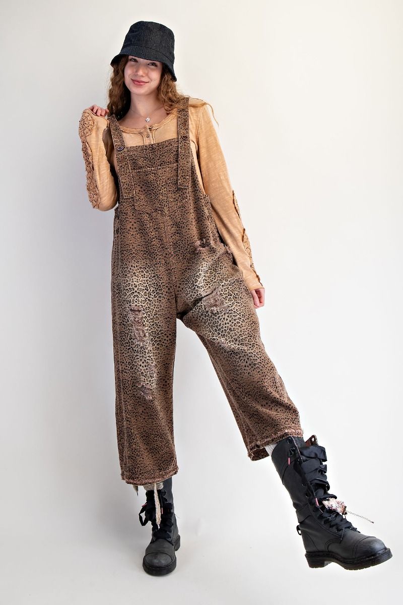 Embrace bold style with these Leopard Washed Denim Overalls, featuring a relaxed fit that keeps comfort front and center. The cropped wide leg adds a fun twist, perfect for showing off your favorite kicks. Adjustable button straps ensure a customized fit, while the front bib with double patch pockets offers handy storage for essentials. Playful and practical, these overalls are your go-to for effortless cool.
