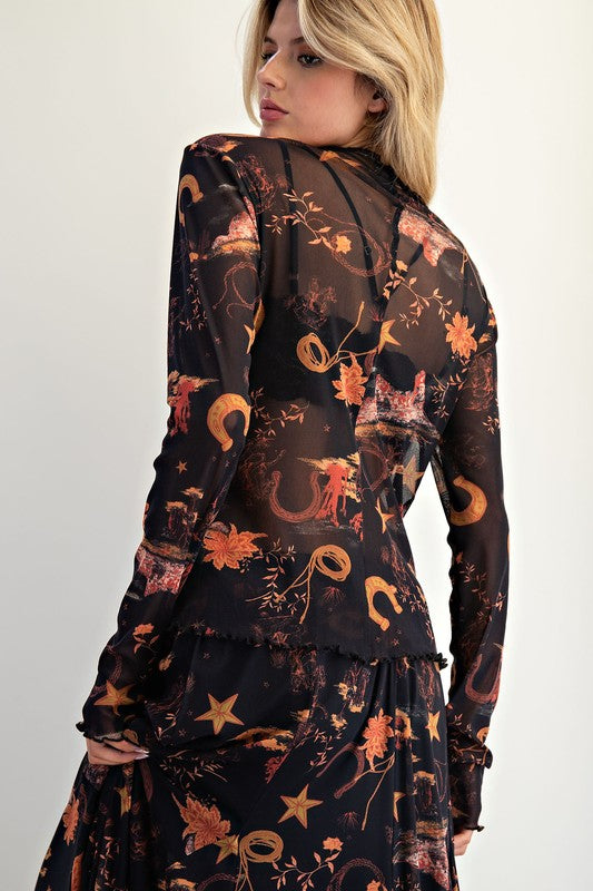 Add some western flair to your wardrobe with our Western Mesh Top! Featuring a sheer mesh design with delicate lettuce trim and a bold western pattern, this top is sure to make a statement. The mock neck adds a touch of sophistication to this playful piece. Yeehaw!