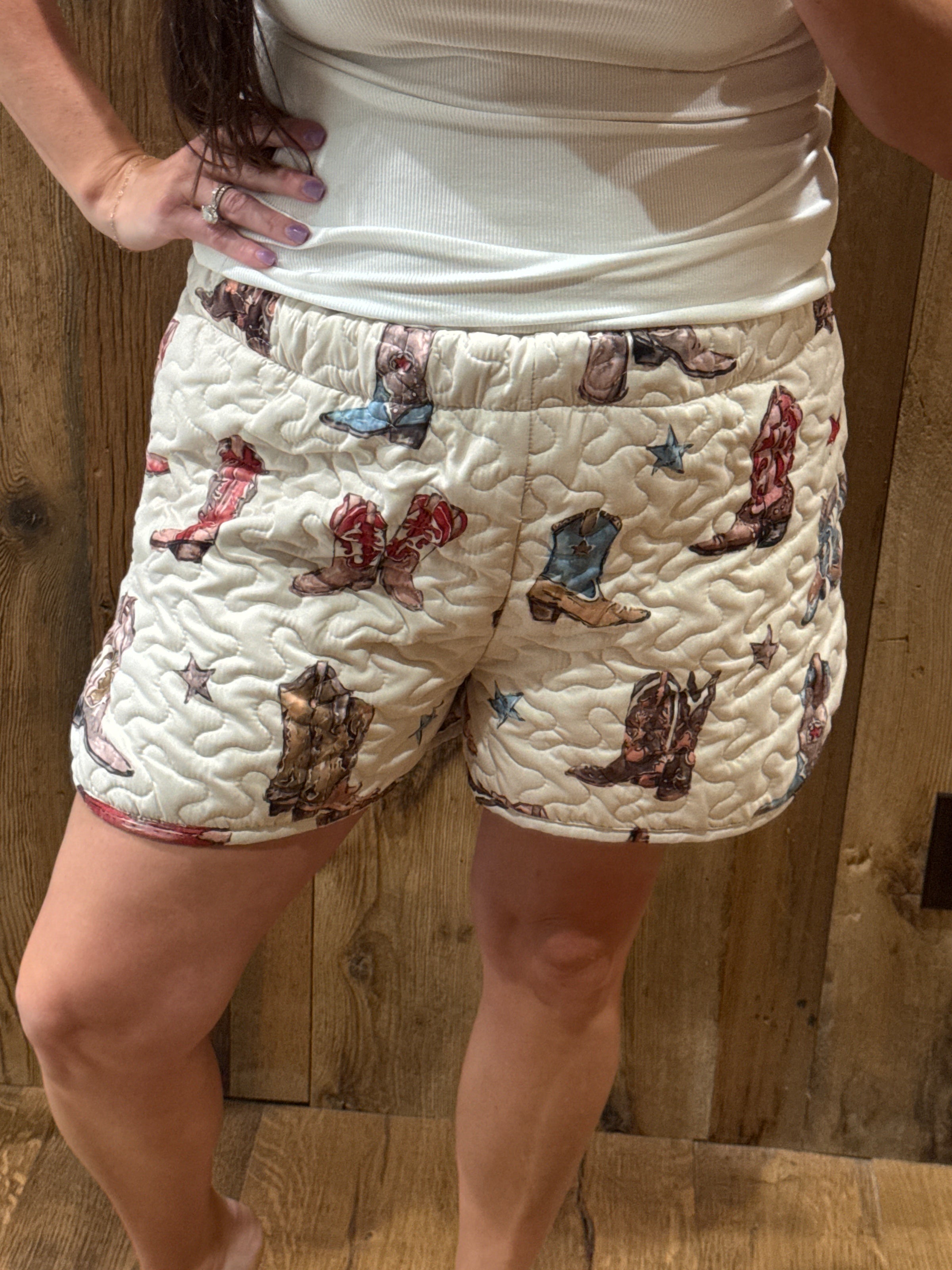 These Quilted Shorts feature a distinctive western print and a scalloped hem, combining classic style with modern detailing. The quilted fabric offers added texture and comfort, making them a versatile choice for both casual and elevated looks. Perfect for those seeking a unique, expertly crafted piece that stands out with subtle sophistication.