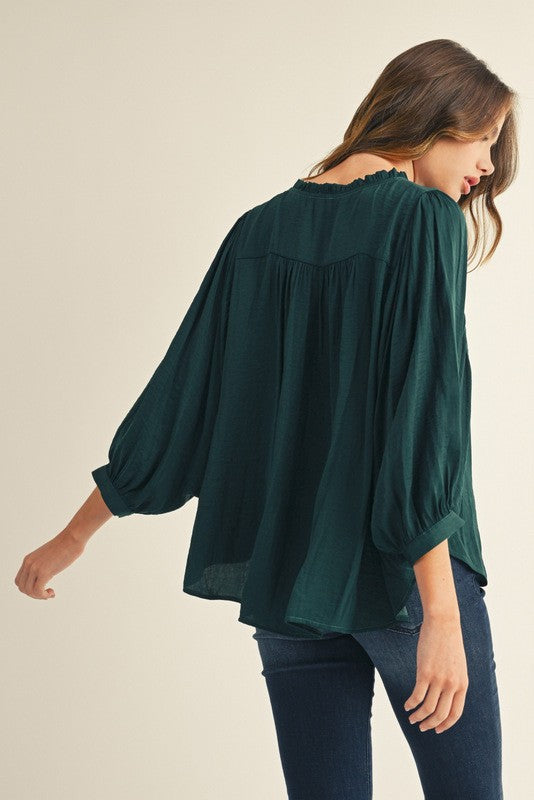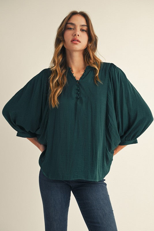 This Long Dolman Sleeve Top offers a relaxed, loose fit for effortless comfort throughout your day. Its distinctive ruffled neckline adds a refined touch of femininity, making it an excellent choice for both casual and semi-formal occasions. The draped dolman sleeves provide ease of movement while enhancing the top’s elegant silhouette. Its versatile design allows for easy pairing with various bottoms, ensuring a polished and stylish appearance.