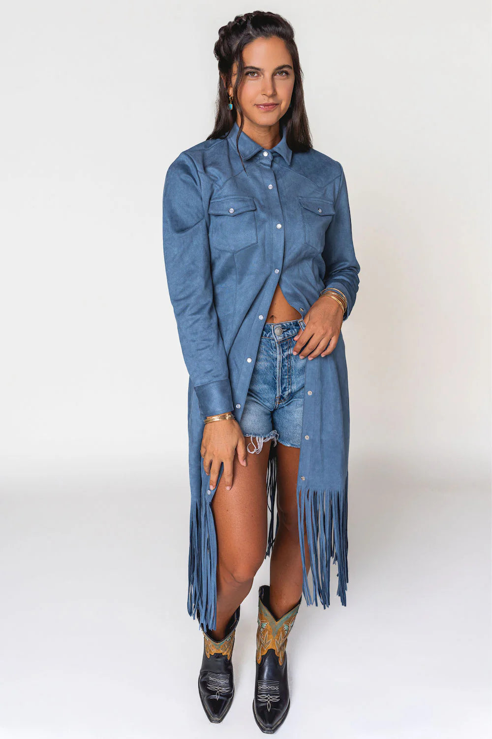 The Annabelle Dress captures western-inspired elegance with its rich suede fabric and distinctive long fringe details. This midi-length dress features intricate embroidery on both the yoke and back, adding refined texture and craftsmanship. Perfect for those seeking a sophisticated yet bold statement piece rooted in classic western style.