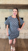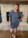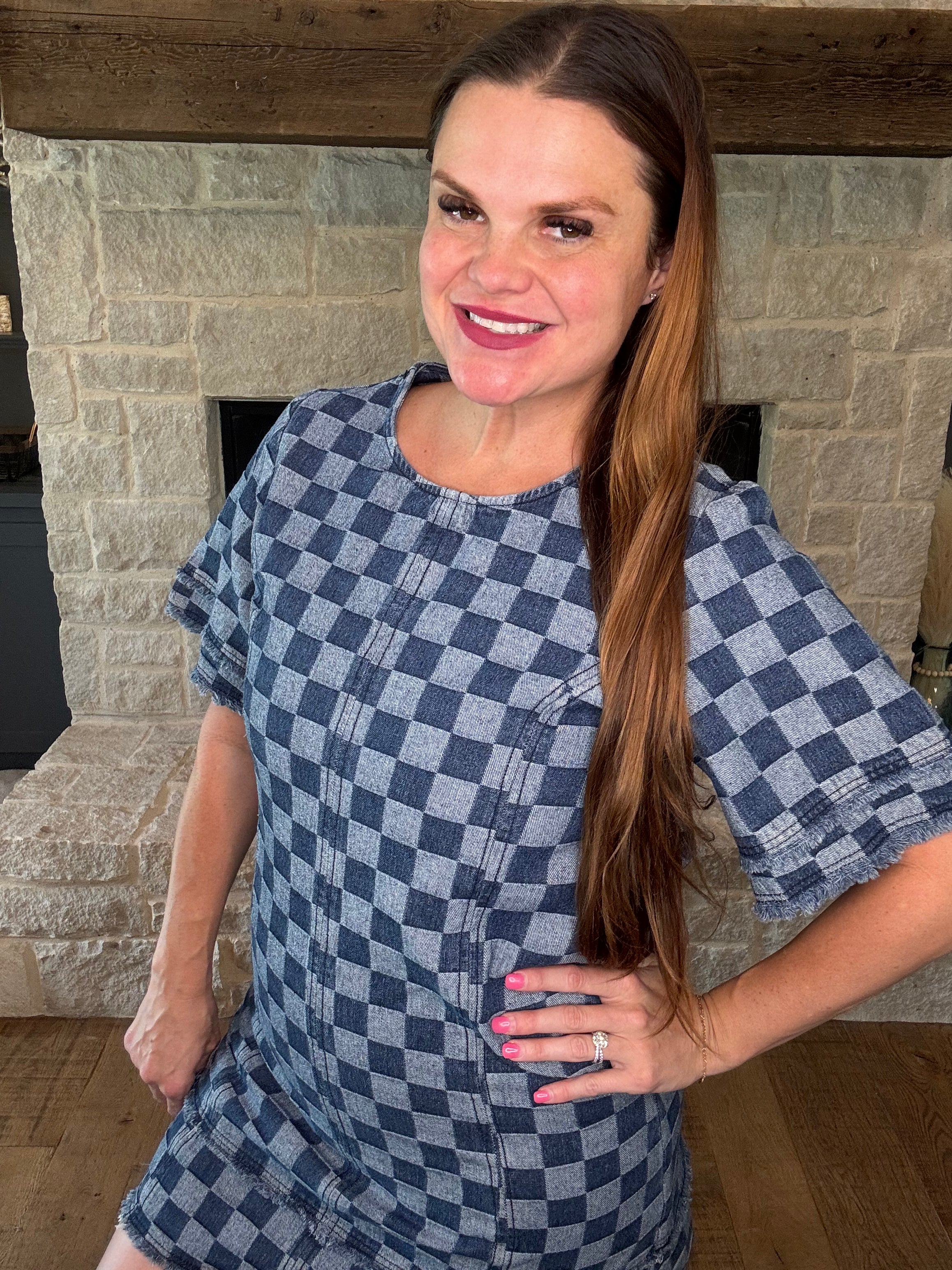 Stay stylish in this Checkered Denim Mini Dress! With a round neckline, short sleeves, and frayed hem detail, it's perfect for any occasion. Plus, it even has side pockets for added convenience. Look cute and keep your essentials close by in this dress!