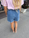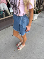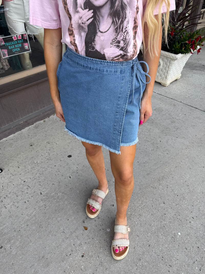 Step into style with our Fray Hem Denim Skort! This unique skort features a playful wrap front design and an adjustable tie for the perfect fit. Perfect for any occasion, this skort is sure to add a touch of fun and flair to your outfit!