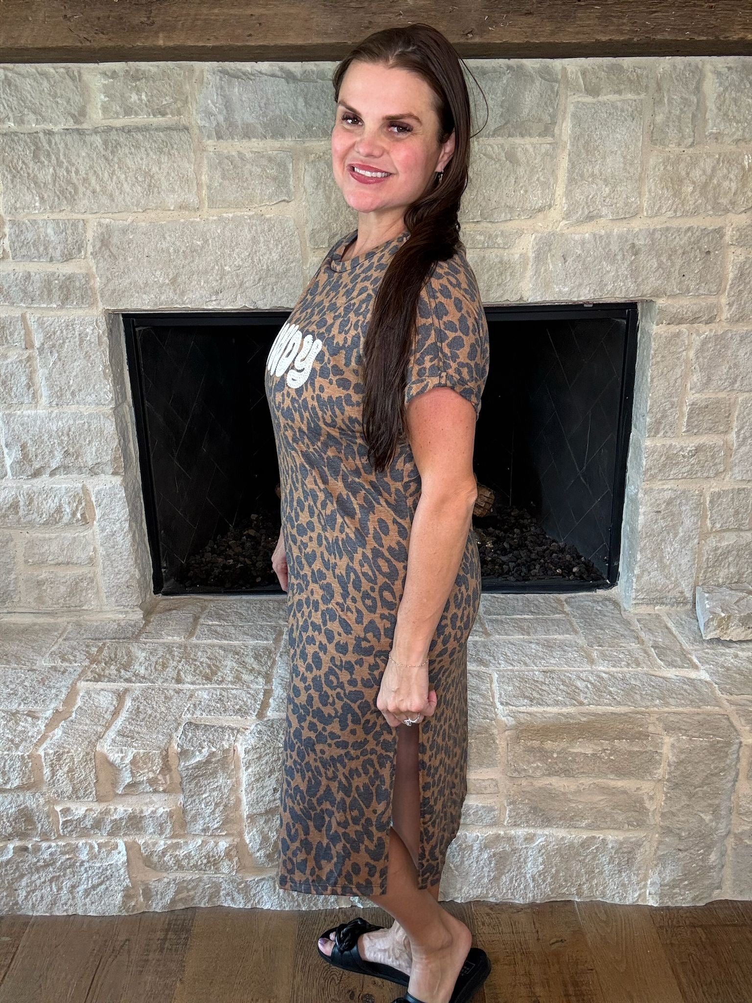Embracing a playful spirit, the Leopard Howdy Maxi Dress features short tacked sleeves and a flirty side slit for easy movement. Its bold leopard print pairs perfectly with the cheeky "howdy" detail, making it a fun statement piece for any casual outing or lively gathering.