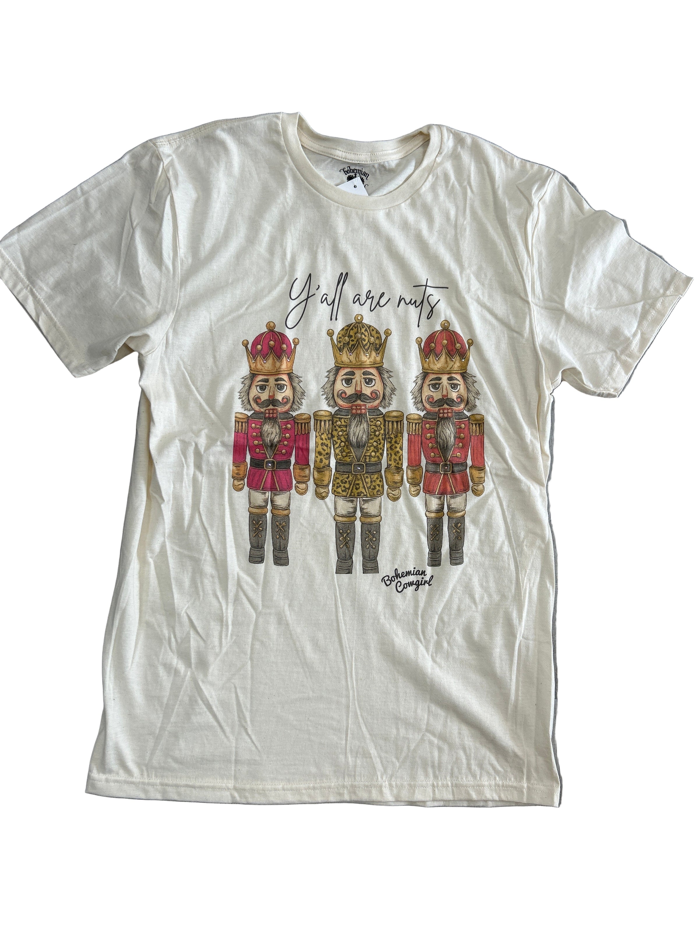 Bring playful charm to your wardrobe with the Y'all Are Nuts Tee. Featuring a fun nutcracker graphic paired with the cheeky phrase “Y’all are nuts,” this tee adds a whimsical touch to casual outfits. It’s perfect for showing off your sense of humor while staying comfortable throughout the day.